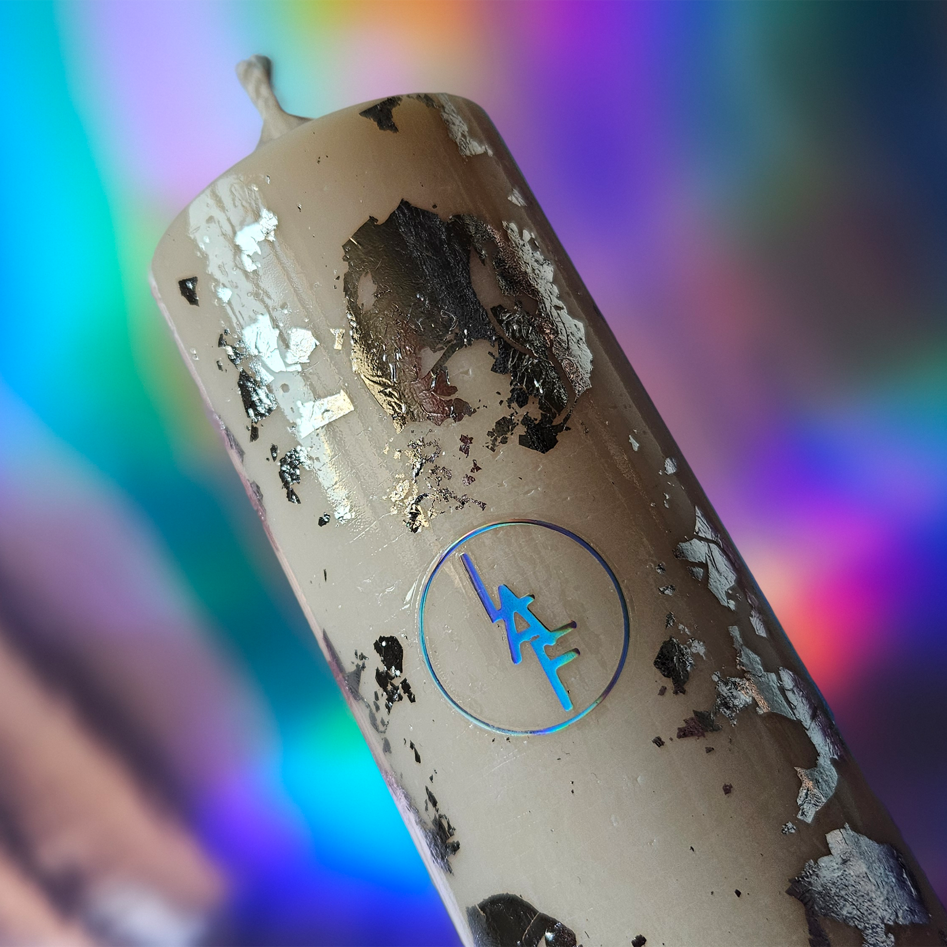 White Candle Elegance resembles an ice sculpture: silver and holographic foil create a clean, radiant finish. Subtle reflections make it visually light and modern.